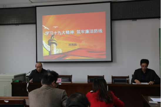 会上,刘西民以《学习十九大精神筑牢廉洁防线》为主题,分别从“党的十八大以来从严治党的系列举措及成效、党的十九大全面从严治党精神及新《党章》简介”两个方面解读了党的十九大报告中中国共产党反腐倡廉的坚定目标。在回顾中国近年来党的发展历史的基础上,列举了一系列党的思想教育活动,并以“打虎”、“拍蝇”、“百人红色通缉令”、“天网”行动、“巡视、派驻”及“八项规定”的出台等实例,为全体参会人员总结了全面从严治党所取得的成效;由此引出了十九大报告精神和新《党章》中透出的全面从严治党的决心,要采取进一步完善法制、健全党和国家监督体系、持之以恒正风肃纪和加强政治思想建设等措施,坚定不移地全面从严治党,不断提高党的执政能力和领导水平。