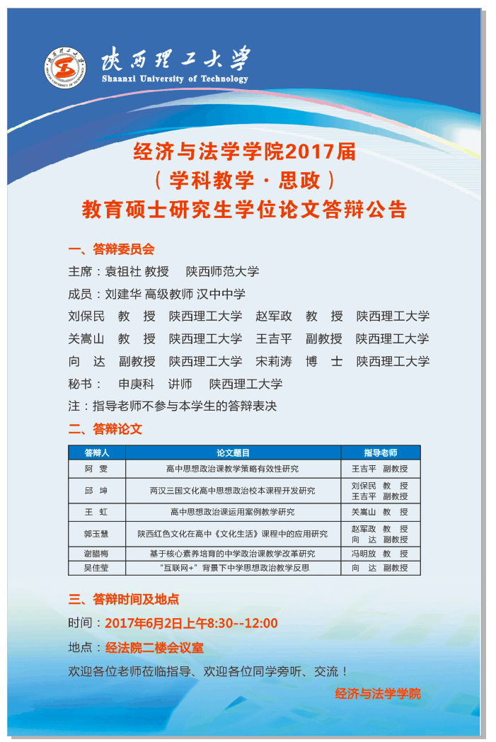 经法学院2017届学科教学思政教育硕士研究生学位论文答辩公告