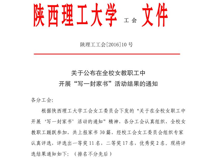 关于公布在全校女教职工中开展“写一封家书”活动结果的通知