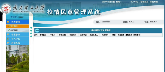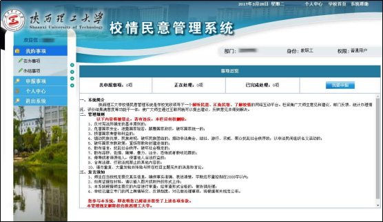 陕西理工大学校“校情民意”管理系统是学校党政利用网络平台为师生员工开通的反映诉求、建议和意见的渠道,旨在“倾听民意、汇集民智、解决问题、监督执行、公开校务”,是集网上公开受理、公开办理、公开反馈和公平评价的管理服务平台。平台通过师生对所提问题办理情况进行满意度评价,有效监管和推动职能部门工作,以提高管理质量和服务水平,切实维护师生的根本利益。