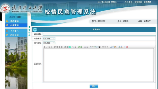 处理部门:选择处理部门,如无法判断可选择提交校总协调岗。